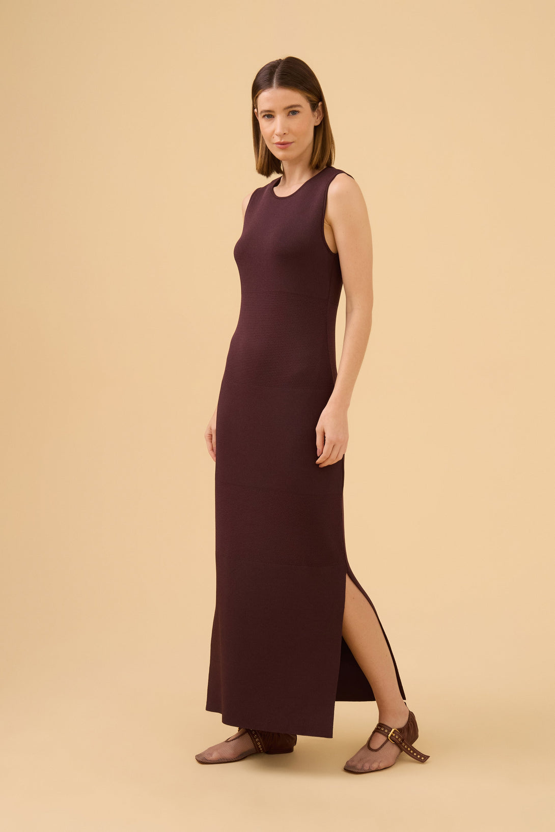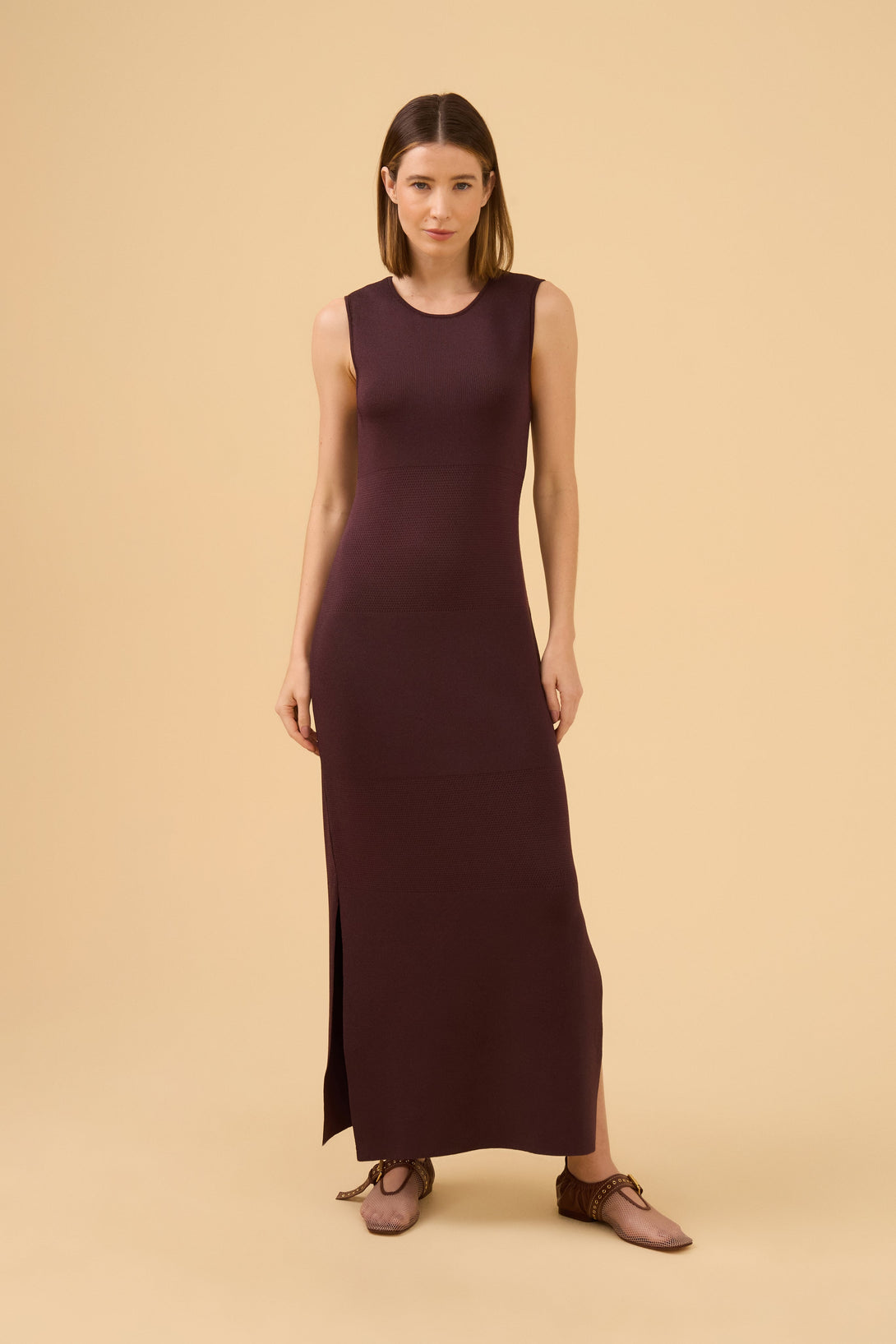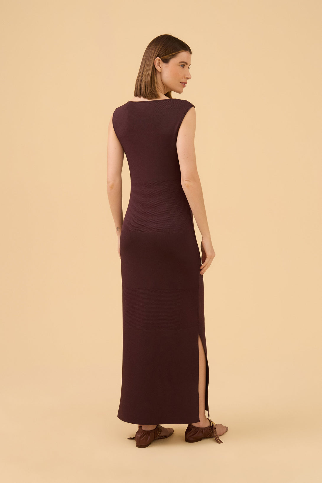 Vestido Midi Listrado Detalhe Em Tricot Tecido em tricot em fio com brilho sofisticado e mix de pontos, gola careca, sem mangas, fenda nas laterais da saia e modelagem justa ao corpo.