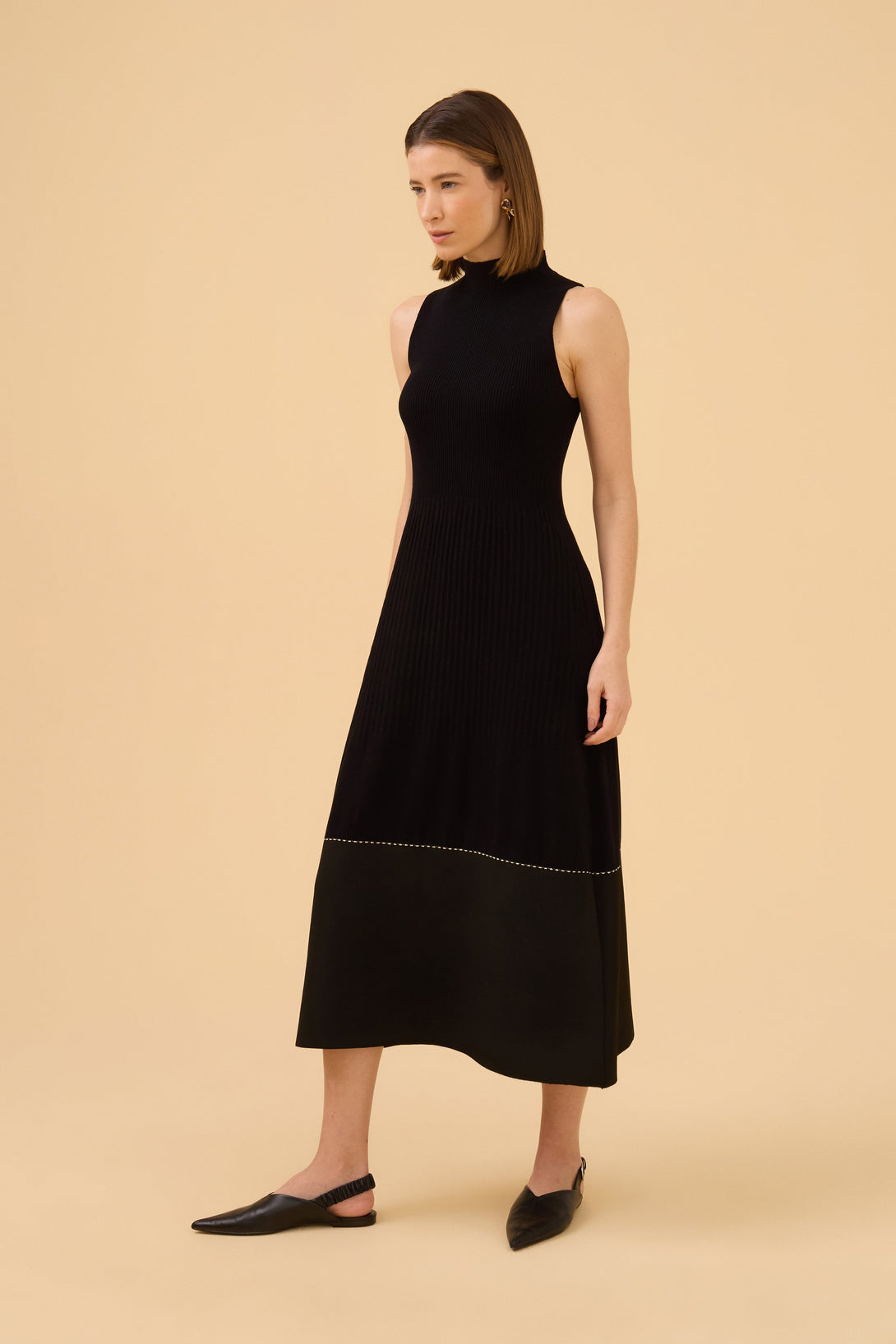 O Vestido Midi Nervuras Com Barra Acetinada Em Tricot Tecido em tricot estruturado com mix de tramas, busto canelado, cintura com nervuras e barra lisa com detalhes em pespontos, comprimento midi, gola alta e sem mangas, modelagem justa ao corpo.