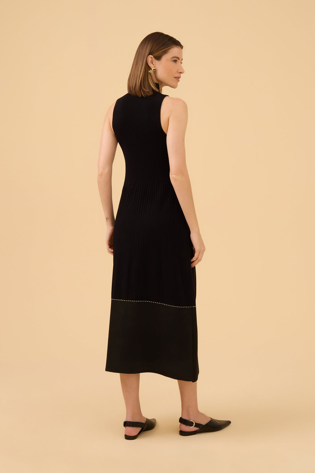 Vestido Midi Nervuras Com Barra Acetinada Em Tricot Preto