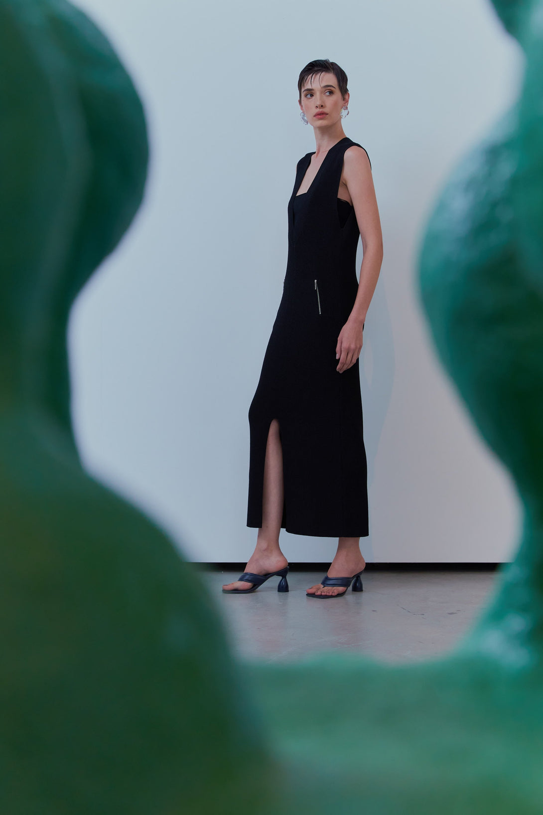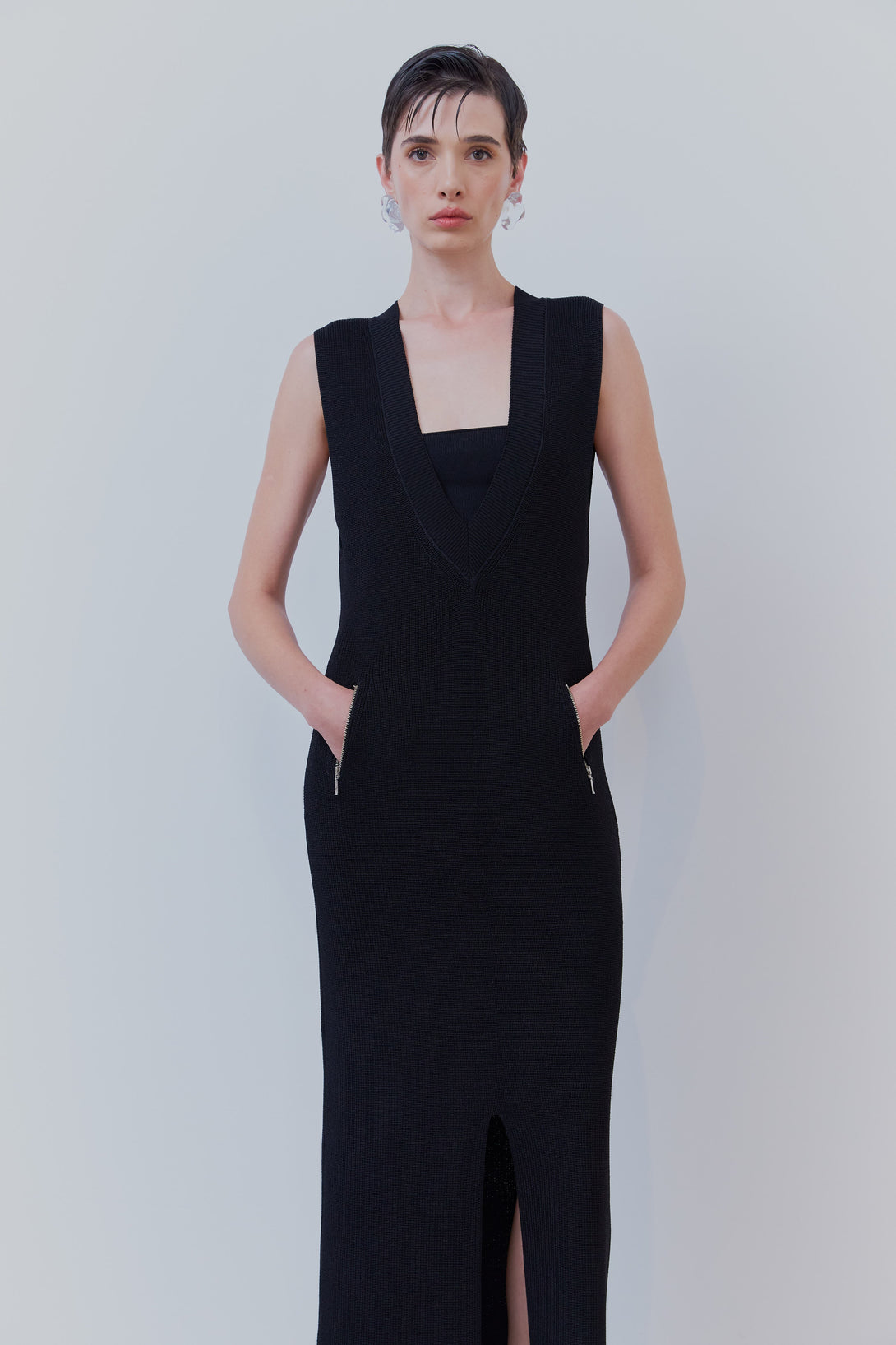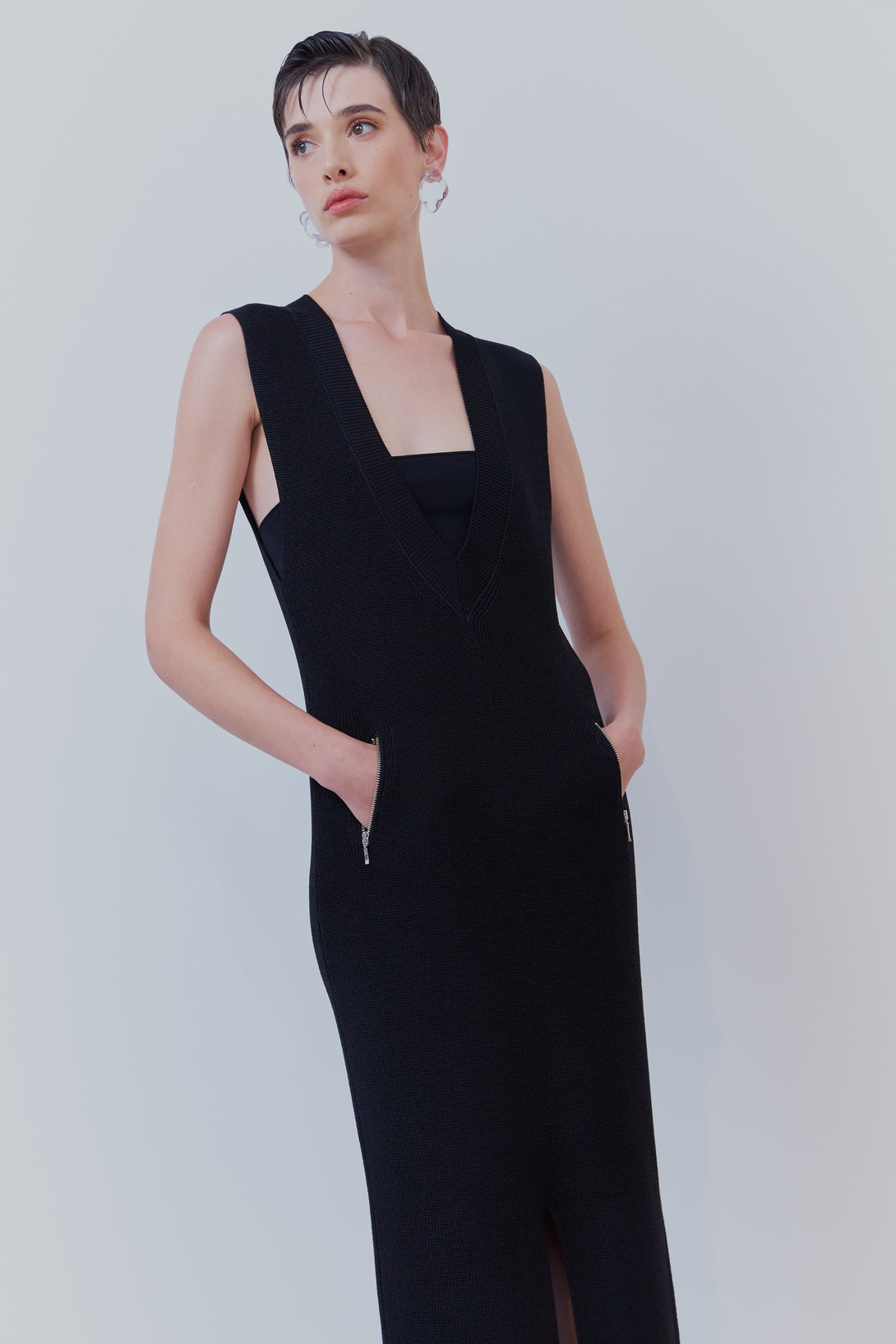 O Vestido Midi Reto em Tricot apresenta decote em V, fenda frontal e um detalhe moderno em zíper. Ideal para realçar seu estilo e sofisticação.