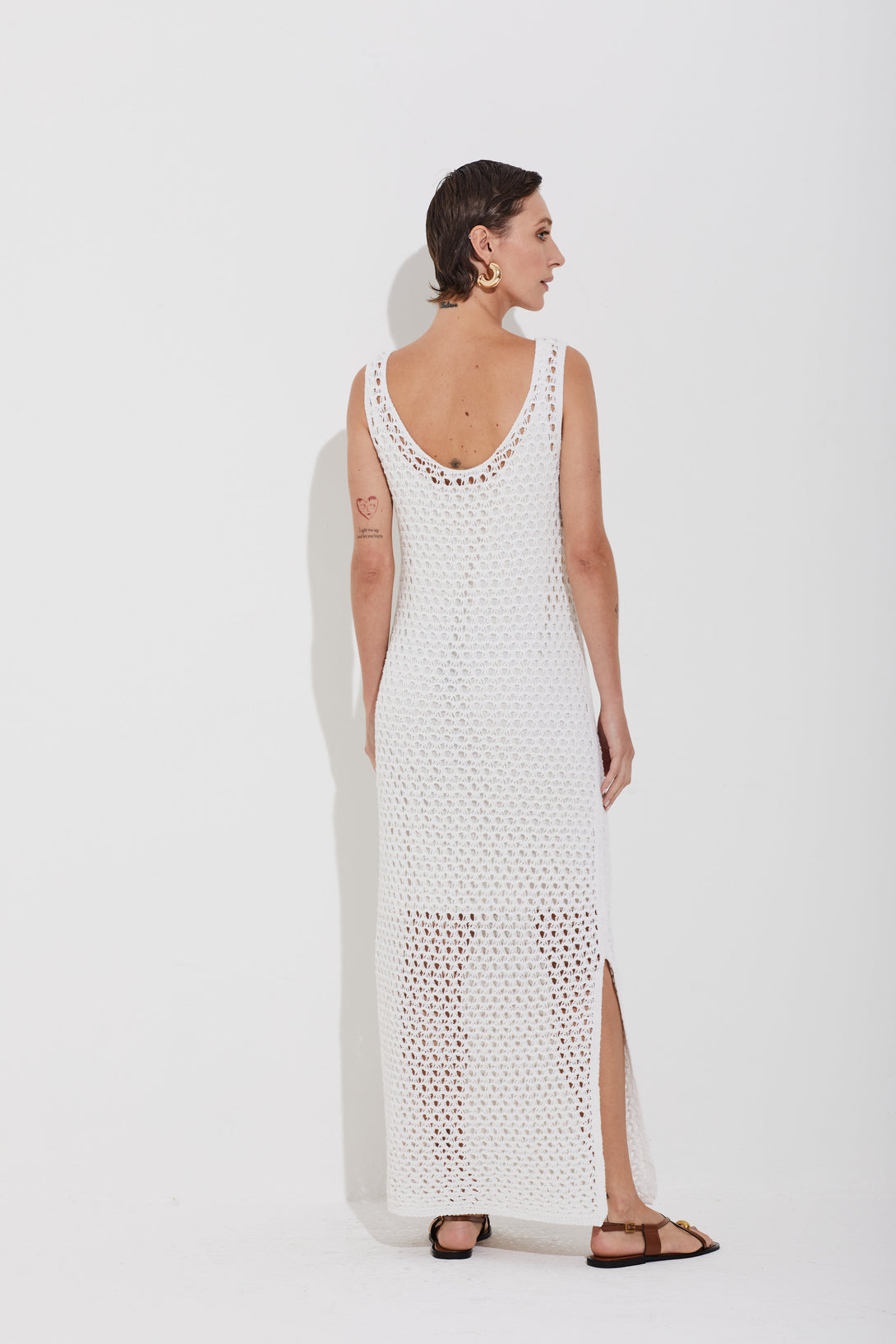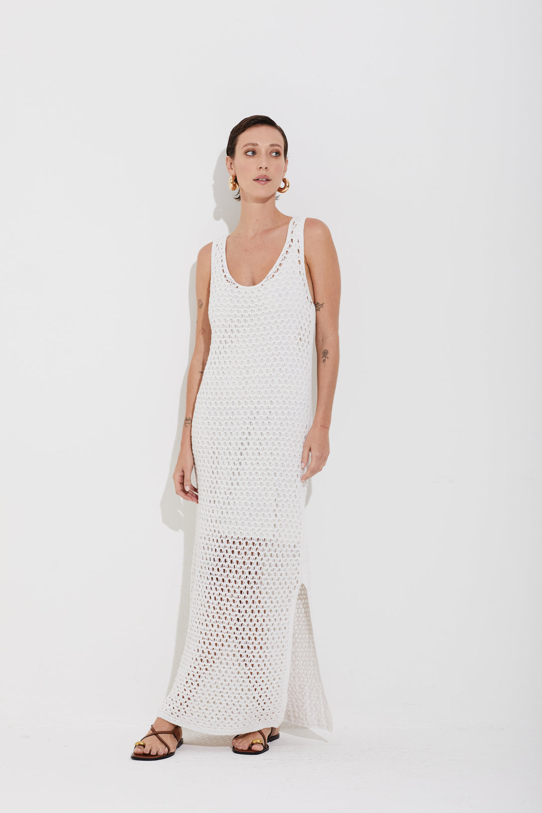 Vestido longo em tricot com referência handmade, confeccionado em fio de algodão reciclado e acabamento em ponto telado vazado, que traz leveza e textura ao visual. Com alças largas, decote U e modelagem reta, tem caimento solto e aberturas laterais que adicionam movimento. O forro em tricot solto acompanha a peça, preservando a leveza e o efeito visual do ponto vazado. Versátil e cheia de personalidade, pode ser usada como saída de praia ou como peça-chave em produções casuais com toque sofisticado.