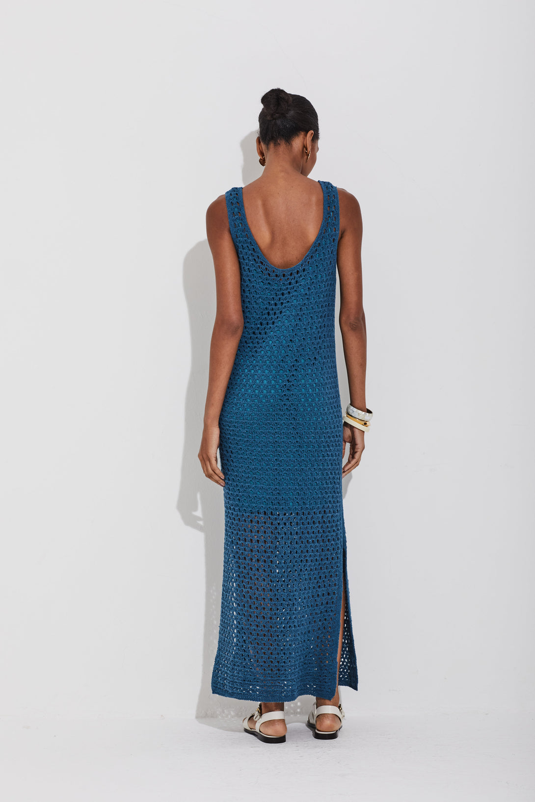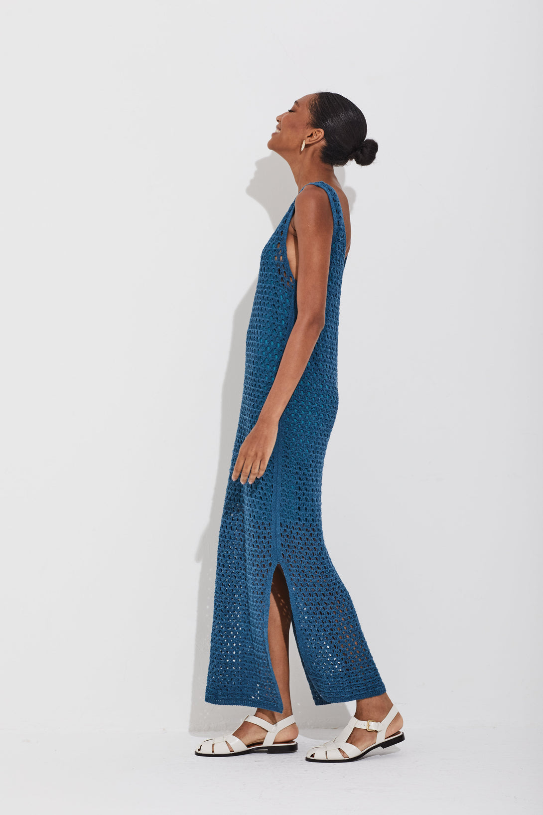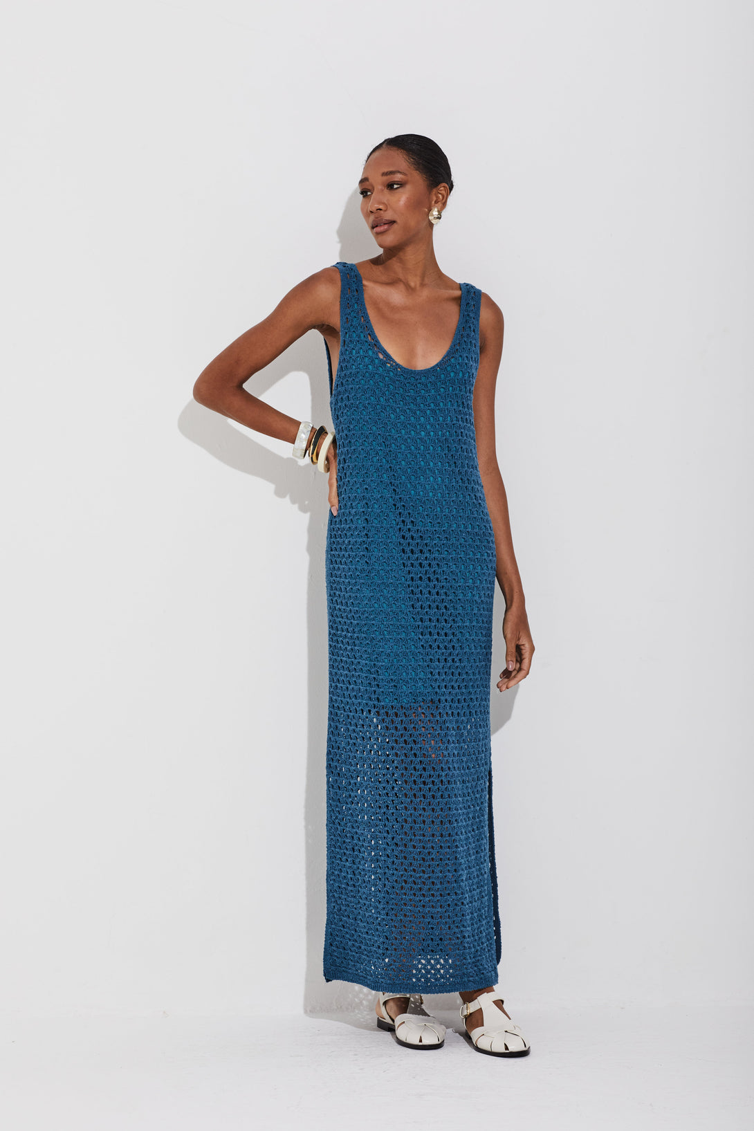 Vestido longo em tricot com referência handmade, confeccionado em fio de algodão reciclado e acabamento em ponto telado vazado, que traz leveza e textura ao visual. Com alças largas, decote U e modelagem reta, tem caimento solto e aberturas laterais que adicionam movimento. O forro em tricot solto acompanha a peça, preservando a leveza e o efeito visual do ponto vazado. Versátil e cheia de personalidade, pode ser usada como saída de praia ou como peça-chave em produções casuais com toque sofisticado.